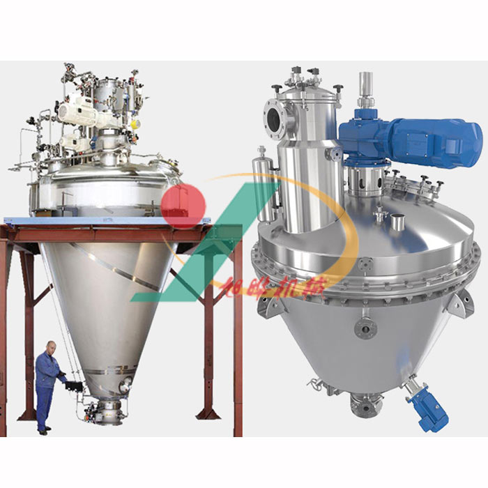 單錐真空干燥機由電機、減速機、機架、機械密封、金屬燒結網過濾器、空心雙螺帶攪拌器、帶夾套加熱的錐型筒體和卸料閥等部件組成。