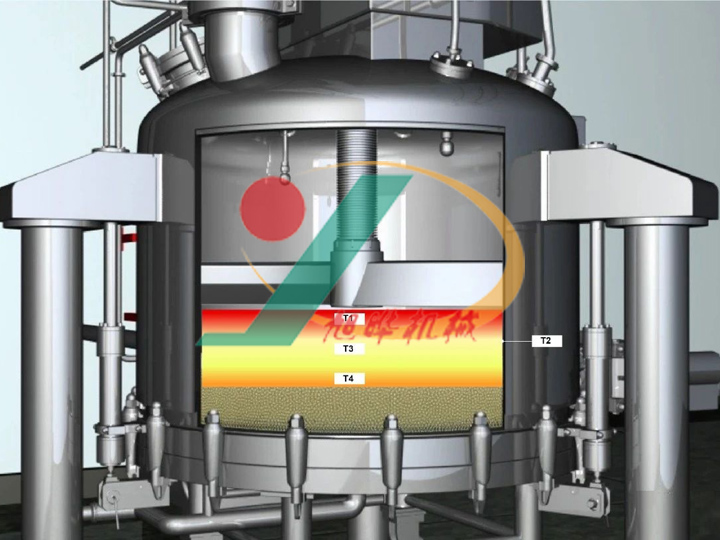 (4) 洗滌:在容器內側裝有萬向清洗球,使清洗液均勻分布于容器內,用以進行物料清洗及容器清洗,通過升降攪拌漿葉的攪拌將濾餅和清洗液混合,使漿狀懸濁液濾餅充分洗滌;