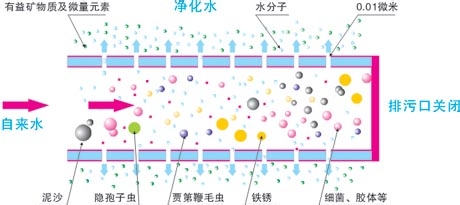 4、反滲透(RO):過濾精度在0.0001微米左右,是美國60年代初研制的一種超高精度的利用壓差的膜法分離技術?蔀V除水中的幾乎一切雜質(包括有害的有益的),只能允許水分子通過。一般用于飲用純凈水、工業超純水、醫藥超純水的制造。反滲透技術需要加壓、加電,水的利用率低。
